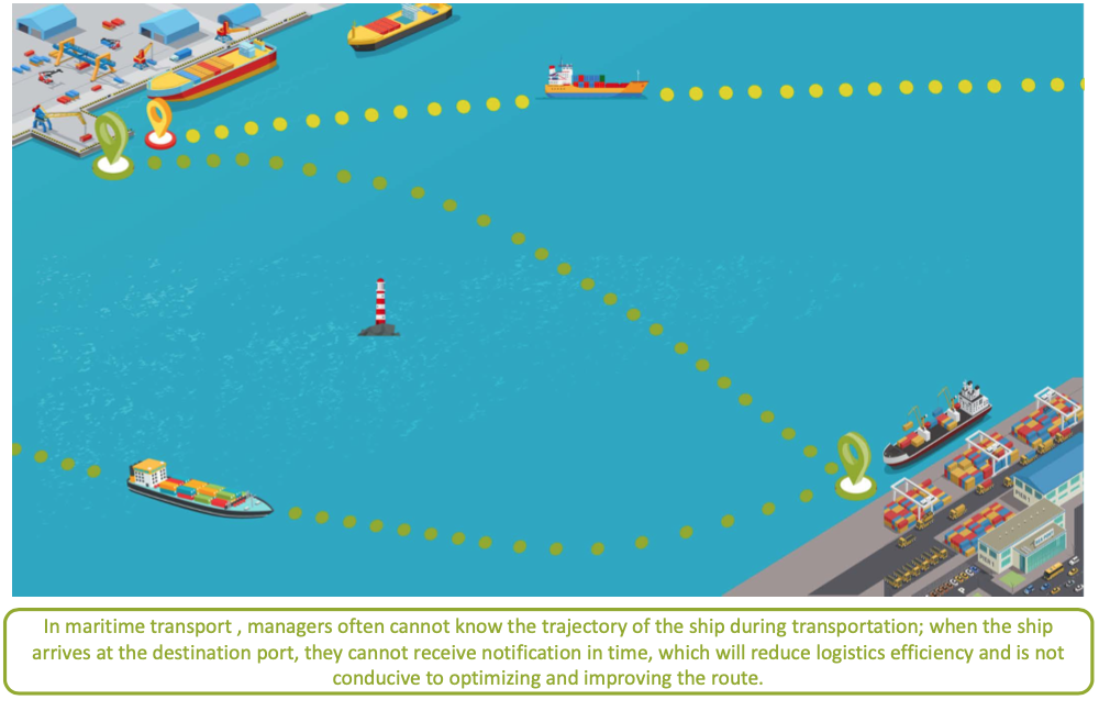 Maritime Transport: Difficulty recording ship navigation tracks, delays in port arrival notifications, and inefficient route optimization.